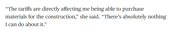 “关税直接影响了我购买建筑材料的能力”,西尔维斯特罗斯说。“我对此完全无能为力。”