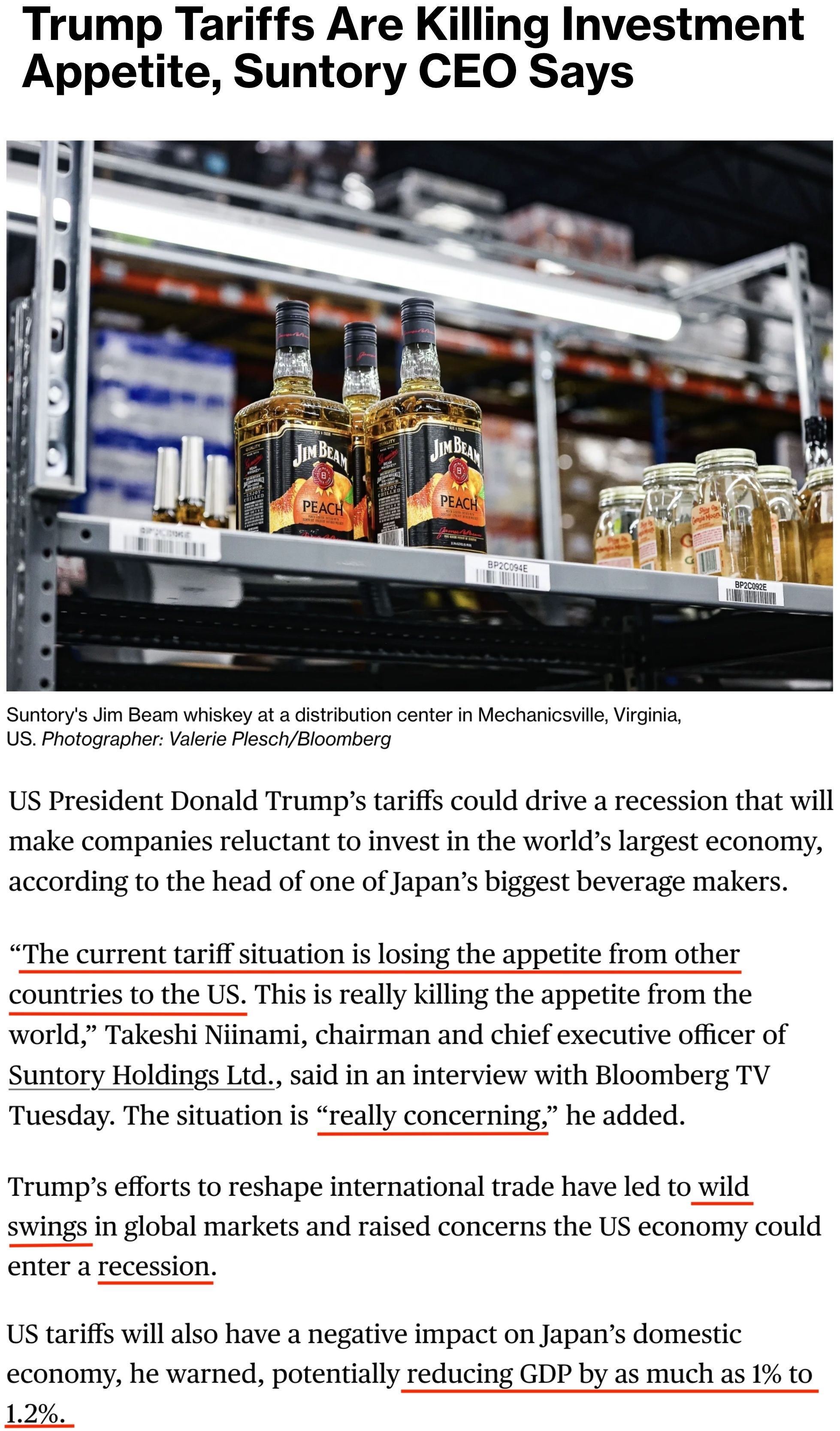 日本首相办公室高级经济顾问、日本最大饮料制造商之一三得利公司董事长兼首席执行官新浪刚史22日接受彭博社采访时警告,美国的关税措施已导致全球市场剧烈波动,可能引发美国经济衰退,并削弱其他国家对美国的投资意愿。
