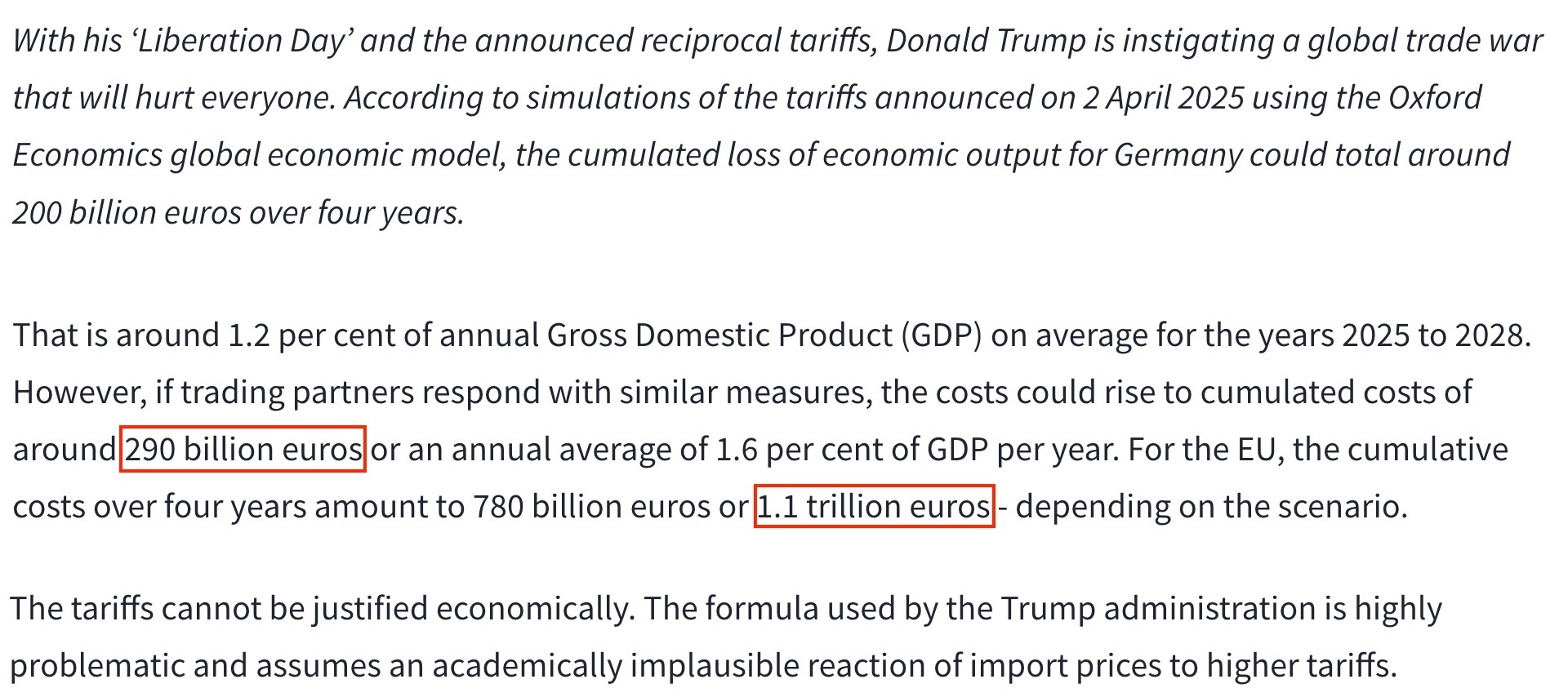德国经济研究所日前发布的研究报告显示,未来四年内,美国“对等关税”措施可能令欧盟损失1.1万亿欧元,仅德国就将损失2900亿欧元。