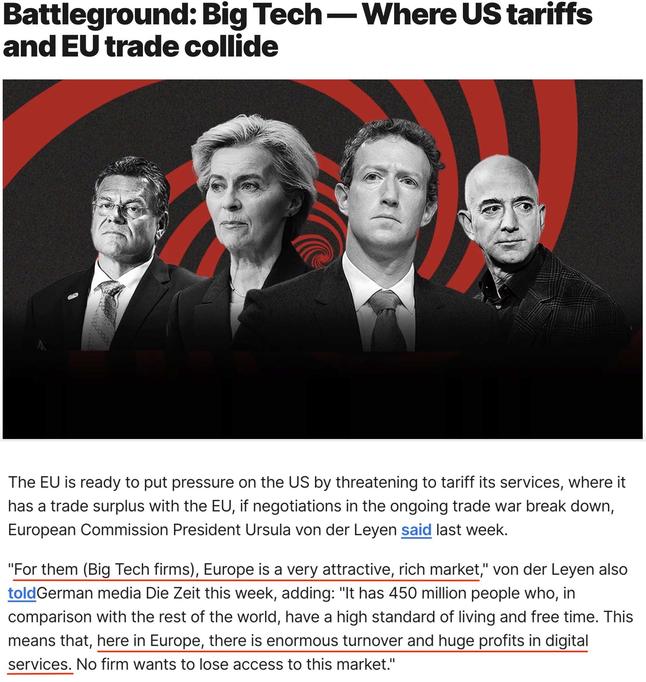 欧盟委员会主席冯德莱恩近日接受欧洲媒体采访时表示,如果与美国的谈判无法让其取消对欧关税,欧盟准备动用“最有力的贸易措施”将大西洋两岸的贸易战扩大到服务领域,包括对美国大型科技公司的数字广告收入征税、限制美国公司参与欧盟公共采购项目等。