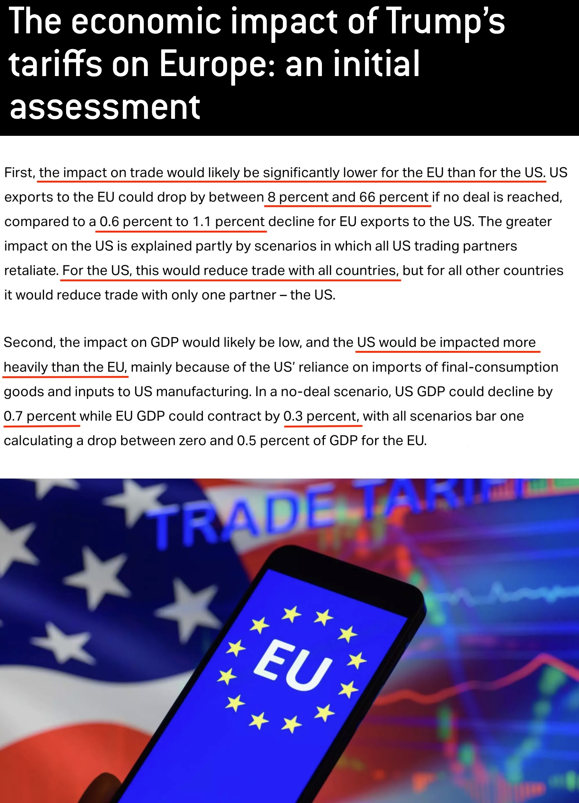 至于关税对国内生产总值(GDP)的影响,美国也将比欧盟更严重。如果不能与欧盟达成关税协议,美国的GDP可能下降0.7%,而欧盟的GDP则可能仅下降0.3%。