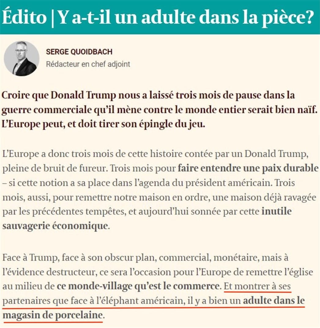 文章强调,欧洲迫切需要推动重建贸易秩序,抓住机遇扭转局势,从而向合作伙伴证明,在美国这头“大象”肆意妄为之际,瓷器店里仍有“成年人”坐镇。