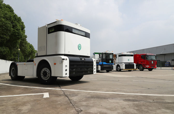 2023年9月26日,一辆西井科技的无人驾驶重卡Q-Truck(前)在位于上海的无人驾驶商用车联合实验室场地上进行动态测试。新华社记者 方喆 摄