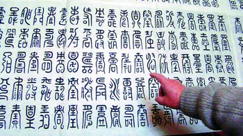 看似简单的“寿”字,仅仅用小篆书写,就能写成10080种不同的样子,你相信吗?昨日,长沙开福区紫荆园社区的朱建南先生首次展出了他耗时6年创作出的书法“百福万寿”长卷作品。该作品长118米,宽0.5米,10080个篆体“寿”字和256个篆体“福”字,千变万化无一重复,吸引了许多市民前来欣赏。朱建南还欲将此作品申报吉尼斯世界纪录。