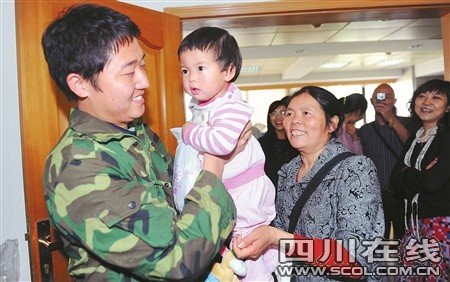 “好可爱,好漂亮哦!”昨日(4月14日)下午2点38分,在华西都市报四楼会客厅,皮肤黝黑一身迷彩服的盛于峰精神抖擞跨进大门的第一眼就认出地上玩耍的小女孩正是他魂牵梦萦的小宝贝。俯身抱起小文文,相隔近一年才有机会的再次对视,盛于峰和文文都咧嘴乐了。正在长牙齿的小姑娘最爱流口水,在盛叔叔的怀抱里,文文嘴边亮晶晶的“招牌”标志涂了叔叔一肩膀,算是给盛叔叔最好的见面礼:叔叔,我长大啰。
