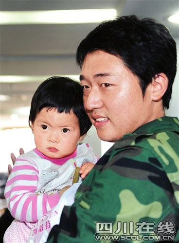 从出生到现在,一岁半的文文和婆婆母秀珍一样都没出过远门。坐进开往成都的汽车,看到两边快速移动的田野、村庄、河流,小文文在婆婆的腿上又蹦又跳兴高采烈,特别是看到“唔——”的一声飞驰而过的大货车,她总要伸出小小的指头咿咿呀呀喊婆婆看。也许是太兴奋了,高速路上没跑多久,看花了眼的文文就在婆婆的怀里睡着了。车过德阳,盛于峰来电了,对他牵挂一年的孩子,他一个劲地询问。提起即将见面的盛于峰,母秀珍说她已完全不记得抱过孙女的这个战士长什么样子了,当时撤离到任家坪时走了7个小时,人困马乏,头晕眼花,就知道眼前一片穿绿军装的人,根本没仔细看。“见了面肯定认不出来,不过很想见见这个孩子,他的年龄跟我媳妇差不多。”