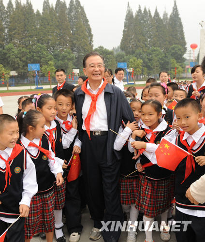 这是9月25日,温家宝在都江堰新建小学与孩子们在一起。新华社记者黄敬文摄