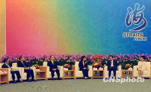 6月19日下午,中共中央政治局常委、全国政协主席贾庆林在厦门会见前来参加第二届海峡论坛的中国国民党副主席黄敏惠、新党主席郁慕明、亲民党秘书长秦金生、无党团结联盟主席林炳坤等台湾嘉宾代表。中新社发刘可耕摄