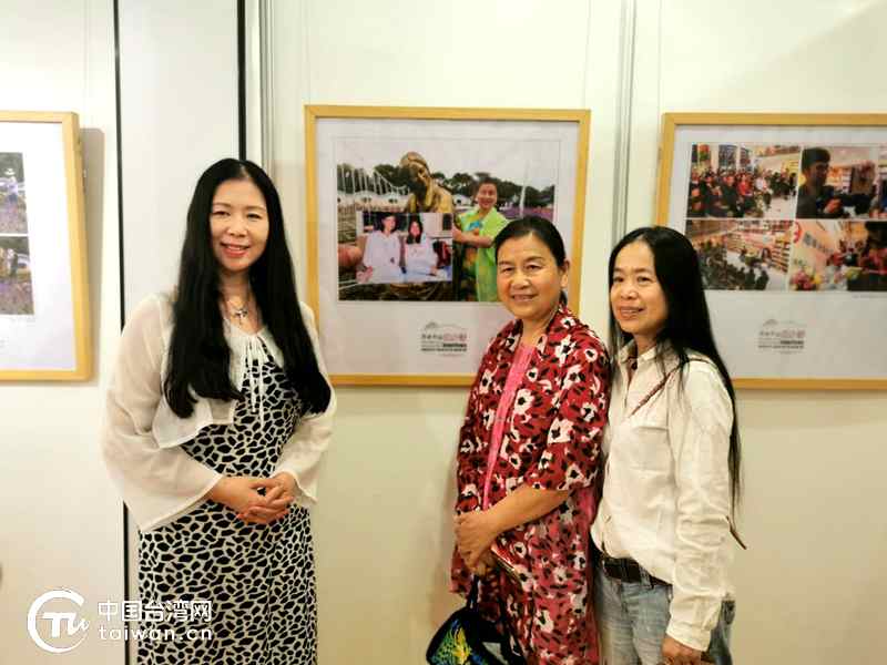 三毛友人杨芳菲(中)及粉丝何冰、邓小群看摄影展。(图片来源:浙江舟山定海区台办)