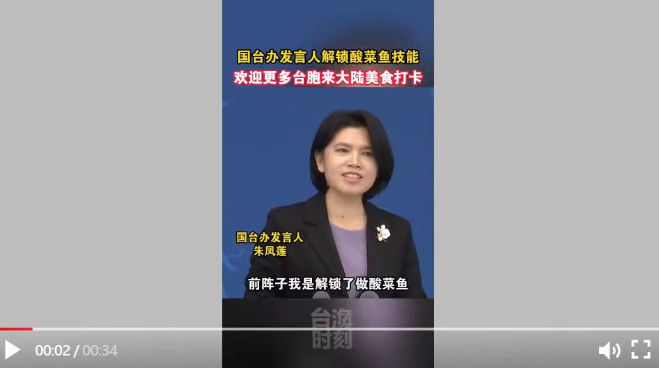 对此,国务院台办发言人朱凤莲表示,说到酸菜鱼,前一阵子我刚刚“解锁”酸菜鱼的做法,这确实是一道很有内容、很有成就感的美食。我知道,台湾有很好的乌鱼、石斑鱼、鲈鱼,相信用来做酸菜鱼味道会很不错,也很适合冬天吃。之前台湾的珍珠奶茶、卤肉饭、炸鸡排在大陆很受欢迎,现在大陆的螺蛳粉、梅花糕、酸菜鱼、椰子鸡在台湾掀起一波又一波“美食热”,充分说明两岸同文同种、同风同俗,有一样的美食爱好,一样的文化品味。欢迎更多的台湾同胞参与到发现美食、发现美好的交流中来,也欢迎更多的台湾朋友到大陆来走走看看,打卡更多地方美食,品尝更多地方特产。