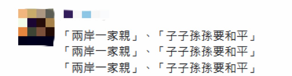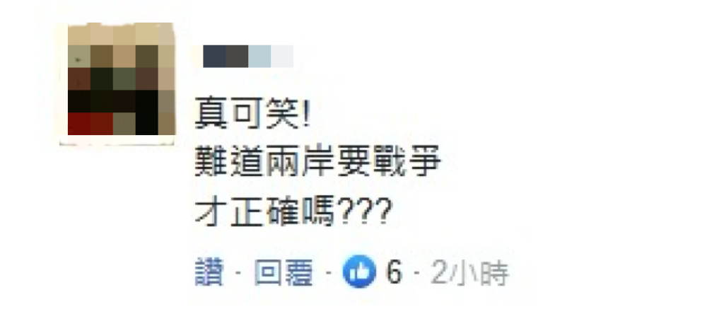 有台湾网友评论也表示,“真可笑!难道两岸要战争才正确吗?”还有网友在评论中重复3遍“两岸一家亲”“子子孙孙要和平”。