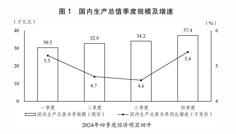 (一)因时因势加强和创新宏观调控,推动经济回升向好。扎实开展宏观政策逆周期调节,加大政策力度,释放政策效能,特别是9月26日中央政治局会议果断部署一揽子增量政策,市场预期、社会信心有效提振,四季度经济明显回升。全年国内生产总值(GDP)134.9万亿元、增长5%,其中,一、二、三产业分别增长3.5%、5.3%、5%。