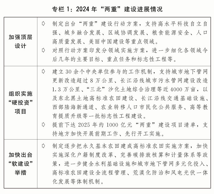 二是发行超长期特别国债支持“两重”建设取得积极进展。着眼于系统解决强国建设、民族复兴进程中一些重大项目建设的资金问题,从2024年起发行超长期特别国债支持国家重大战略和重点领域安全能力建设。坚持自上而下、软硬结合,建立实施项目储备、集中联审、专款专用、强化监督等全链条推进保障机制。“硬投资”方面,严格做好项目筛选,2024年安排7000亿元超长期特别国债支持1465个重大项目建设,项目基本全部开工、全年完成投资超过1.2万亿元。“软建设”方面,坚持项目建设和配套改革相结合,扎实推进规划编制、政策制定和体制机制改革创新,不断完善投入机制、提高投入效率。规范项目全过程管理方面,出台“两重”建设有关管理办法,督促项目加快开工建设,严格资金监管,加强监测调度和现场监督检查,确保建成优质工程、精品工程、放心工程。