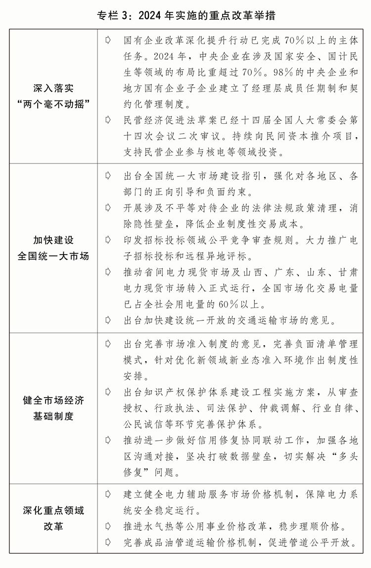 (二)进一步全面深化改革,发展动力活力不断增强。认真落实党的二十届三中全会部署的重要改革举措,深化经济体制改革,经济发展内生动力、创新活力持续激发。