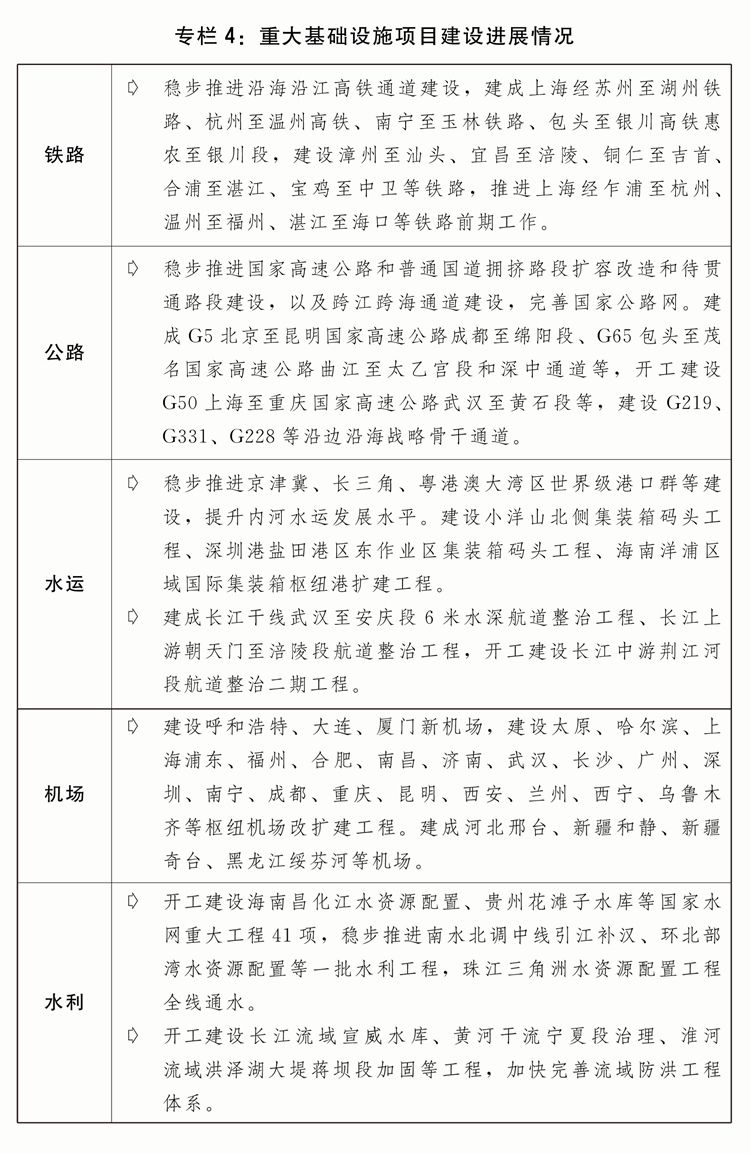五是加快完善现代化基础设施体系。高质量推进川藏铁路等重大项目建设,加快构建国家水网工程体系,高水平共建西部陆海新通道。深入实施降低全社会物流成本专项行动。持续推进国家物流枢纽、国家骨干冷链物流基地、国家综合货运枢纽体系、大宗商品资源配置枢纽等布局建设。加快完善应急物流体系。深入推进公路水路交通基础设施数字化转型升级。推动各种运输方式规则标准统一协同,加快多式联运“一单制、一箱制”应用。