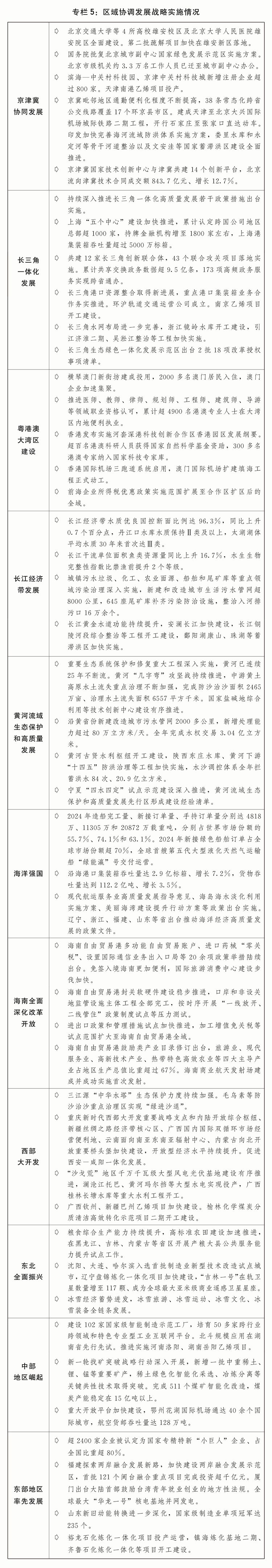 一是区域协调发展积厚成势。京津冀协同发展走深走实,在京相关高校、医院、中央企业总部及二三级子公司分批向雄安新区疏解,北京城市副中心行政办公、商务服务、文化旅游等功能不断完善,进一步支持天津滨海新区高质量发展若干政策措施出台实施,三省市互联互通交通网络更加完善、产业链上下游协作持续强化、公共服务共建共享水平进一步提升。长三角一体化高质量发展深入推进,生态绿色一体化发展示范区改革授权压茬推进,港口资源整合、轨道互联互通等取得新进展,上海“五个中心”建设进一步加快。粤港澳大湾区建设迈上新台阶,横琴粤澳深度合作区封关“一线”“二线”分线管理运行顺利,超1.6万名澳门居民在合作区居住生活,支持河套深港科技创新合作区深圳园区、香港园区联动发展,创新要素跨境流动更加便捷。长江经济带共抓大保护、不搞大开发成效显著,进一步抓实抓好长江大保护工作三年行动计划出台实施,长江十年禁渔取得明显成效,长江干流连续5年保持Ⅱ类水质,综合立体交通走廊加快构建,沿江高铁全线开工建设。黄河流域生态保护和高质量发展迈出坚实步伐,农业面源、城镇生活、工业和尾矿库污染治理深入推进,8万余个入河排污口开展溯源整治,一批生态保护修复重点项目加快建设,黄河干流连续3年保持Ⅱ类水质。海洋强国建设深入推进,海洋强省、现代海洋城市、全国海洋经济发展示范区创新发展,海洋生态环境质量持续改善,海洋生产总值超10万亿元。