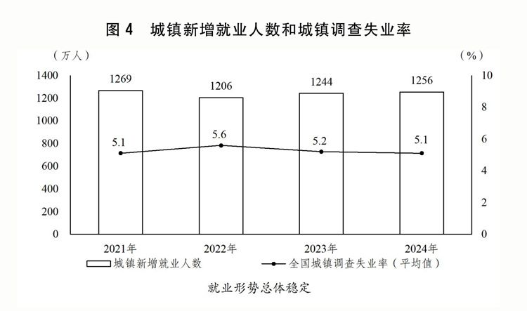 一是稳就业促增收取得积极成效。出台实施就业优先战略促进高质量充分就业的意见。延续实施失业保险援企稳岗政策,优化整合吸纳就业补贴和扩岗补助。强化高校毕业生、脱贫人口、农民工以及就业困难人员等就业帮扶。实施高校毕业生等青年就业服务攻坚行动、先进制造业促就业行动和百万就业见习岗位募集计划,构建高校毕业生高质量就业服务体系。加大力度支持公共实训基地建设,持续做好重点人群技能培训。做好退役军人就业服务保障,提高优抚补助标准。城镇新增就业1256万人,城镇调查失业率平均为5.1%。全国居民人均可支配收入实际增长5.1%。城乡居民人均可支配收入比为2.34,城乡居民收入相对差距继续缩小。指导地方上调最低工资标准。向困难群众发放一次性生活补助,惠及1100多万人。