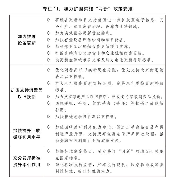 四是加力扩围实施“两新”政策。安排超长期特别国债5000亿元支持大规模设备更新和消费品以旧换新,统筹投资、财政、金融等综合性政策,深入推进设备更新、消费品以旧换新、回收循环利用、标准提升四大行动。进一步加大重点领域设备更新项目支持力度,加力实施设备更新贷款贴息,加快存量设备评估诊断和项目储备。进一步支持消费品以旧换新,扩大汽车报废更新支持范围,完善汽车置换更新补贴标准,实施手机、平板等数码产品购新补贴,积极支持家装消费品换新,简化补贴申领和支付流程,完善资金监管机制,严厉打击价格欺诈和违规骗补套补行为。