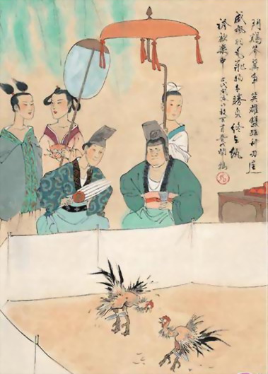 娱乐斗鸡发展成赌博,赌徒们就更如痴如狂了。唐代韩愈与孟郊以斗鸡为题写过精彩的联句,描述两鸡恶斗,斗鸡人在胜负未卜时,“旁惊汗流浼”,紧张不安,汗流满面。优劣分明时,“知雄欣动颜”,胜的一方高兴得眉飞色舞。败的一方“怯负愁看贿”,眼看输掉钱财,愁眉苦脸。人们“争观填道,助叫波翻海”。是讲观者挤满街市道路,呐喊惊叫之声,如大海怒涛。真是如醉如狂呀!