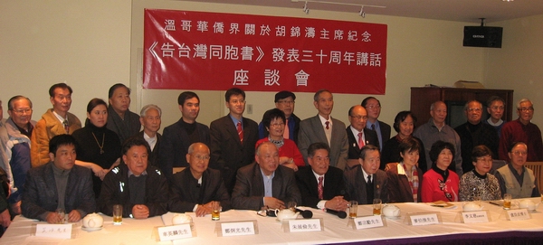 1月12日,来自大温哥华36个侨团的60多名代表在温哥华华埠举行座谈会,就中国国家主席胡锦涛提出的促进两岸关系六点意见畅谈体会,发表看法,并呼吁以实际行动促进统一,首先实现两岸三地侨团的“三通”。 与会者认为,胡锦涛的讲话展现了关爱台湾同胞的亲情和善意,对维护两岸关系和平发展显示了诚意,既有原则的坚定性,又有高度的宽容和气量。讲话回顾总结了30年来两岸关系发展取得的巨大成就和基本经验,适应时代发展潮流,提出了推动两岸关系和平发展新思路的六点意见,为今后推动和平统一的工作提供了更加明确的指导方针,具有重大的现实意义和深远的历史意义。加拿大中国统一促进会副会长车英麟认为,讲话中存在着很多亮点和新思维,包括科学地界定两岸关系,明确指出世界上只有一个中国,“两岸终归统一,不是主权和领土再造,而是结束政治对立”;“只要民进党改变台独分裂立场,我们愿意作出正面响应”;“两岸可以就在国家尚未统一的特殊情况下的政治关系展开务实探讨”。会后,参与座谈会的侨团还在当地各大中文报章联合刊登座谈会简报,表达他们对“胡六点”的体会和看法。