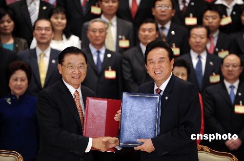 4月26日下午,陈云林和江丙坤交换协议文本。当日,海协会和海基会在南京紫金山庄签署《海峡两岸空运补充协议》、《海峡两岸金融合作协议》、《海峡两岸共同打击犯罪及司法互助协议》三项协议。 中新社发 廖攀 摄