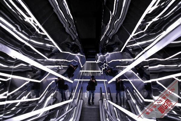 资料图片:一名观众在太空家园馆“时空隧道”内拍照(4月15日摄)。 新华社记者 裴鑫 摄