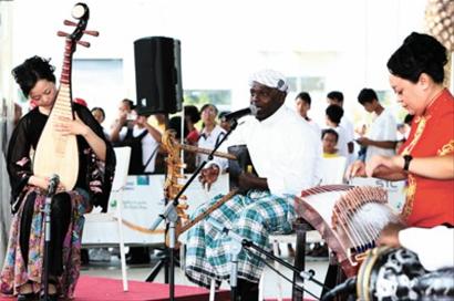 中国的琵琶、古筝与沙特的乌德琴、阿拉伯鼓合奏出现在世博园。从昨天中午12点开始,每隔两个小时,中沙两国艺术家在沙特馆合作演出,庆祝两国建交20周年。