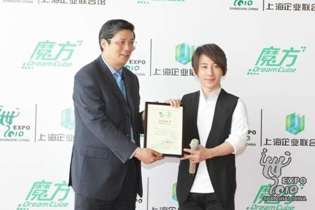 刘谦接过上海企业联合馆志愿者证书(图片来源:世博网)