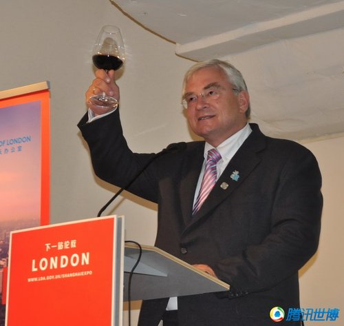 2010年7月27日晚,上海世博会英国馆(网上英国馆)内,伦敦市副市长理查德-巴恩斯为庆祝奥运会倒计时举杯
