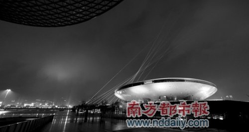 世博文化中心以及对岸的激光造型。新华社发