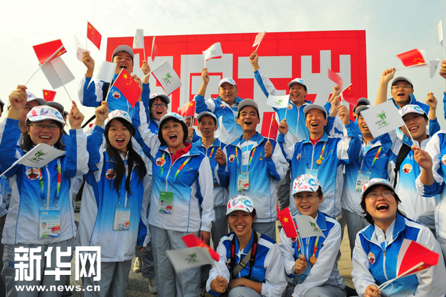 10月1日,世博会城市服务站点志愿者代表在活动现场欢呼。新华社记者 杨光 摄