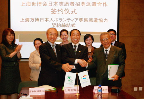 中新网5月14日电 据上海世博会官方网站消息,5月13日下午,上海世博局与“日中友好支援中心”和“爱·地球博志愿者中心”两家日方机构签署合作意向书,委托该两家机构在日本境内招募并派遣志愿者参与上海世博会志愿服务。上海世博局党委副书记许伟国与日方代表签署合作意向书。