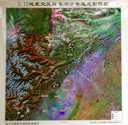 2008年5月22日(星期四)14时国务院新闻办召开新闻发布会,邀请国土资源部党组成员、副部长贠小苏介绍国土资源部门防范次生地质灾害工作情况,并答记者问。图为现场展示的5.12地震灾区堰塞湖分布遥感影像图。中国政府网 李非 摄
