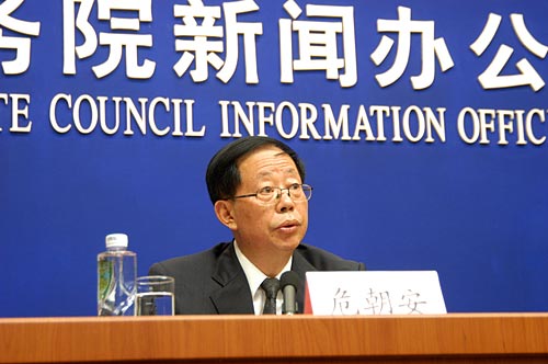 图为农业部副部长危朝安介绍当前农牧业灾情、农业抗震救灾、灾区农产品供应、人畜共患病防治以及农业生产等有关情况。中国政府网 张泳摄