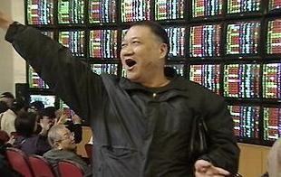 马英九特别费案二审获判无罪,台股一度瞬间急拉百余点,一名投资人高兴的举臂欢呼。(东森新闻图)