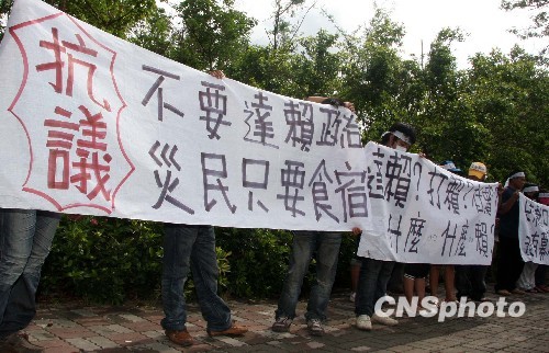 8月31日上午,来自屏东雾台乡等地的部分“88水灾”受灾民众,打着横幅在达赖喇嘛下榻的高雄市莲潭会馆外抗议。中新社发 董会峰 摄