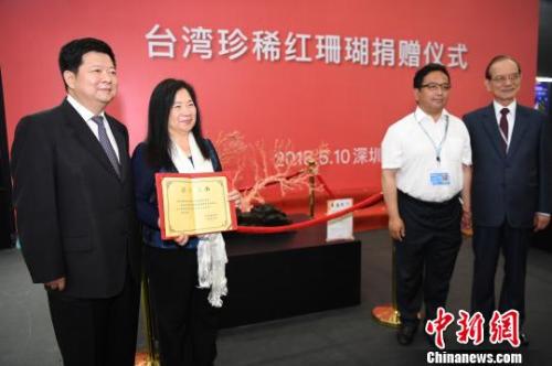 中新社深圳5月10日电 (沈钊)台湾绮丽珊瑚有限公司董事长洪明丽10日在第十四届深圳文博会上向北京故宫博物院和西藏布达拉宫捐赠了两株珍贵的红珊瑚树,国务院台湾事务办公室副主任龙明彪、国民党荣誉副主席林丰正等出席了当天捐赠仪式。