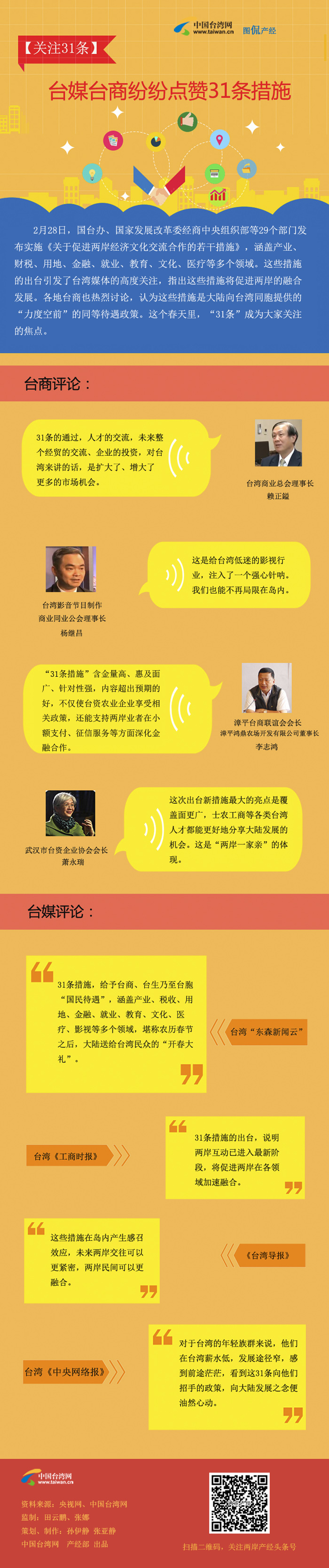 2月28日,国台办、国家发展改革委经商中央组织部等29个部门发布实施《关于促进两岸经济文化交流合作的若干措施》,涵盖产业、财税、用地、金融、就业、教育、文化、医疗等多个领域。这些措施的出台引发了台湾媒体的高度关注,指出这些措施将促进两岸的融合发展。各地台商也热烈讨论,认为这些措施是大陆向台湾同胞提供的“力度空前”的同等待遇政策。这个春天里,“31条”成为大家关注的焦点。
