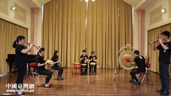 台北艺术大学传统音乐系的学生表演北管乐曲牌《斗鹌鹑》。(图片来源:保定市台办)