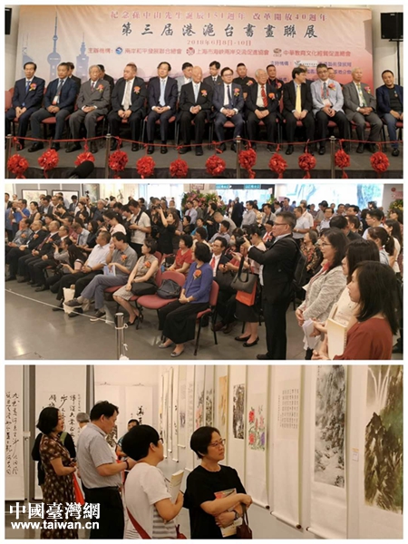 中国台湾网6月11日上海讯 6月8日,纪念孙中山先生诞辰151周年、改革开放40周年——第三届沪港台书画联展在香港中央图书馆举行。创会主席陈守仁致欢迎词,香港中联部台务部长杨流昌、香港艺术发展局主席王英伟、中国书协香港分会会长施子清、上海书协主席周志高、巾华文教经贸促进会会长张永山等致辞,上海市政府台办副主任李骁东等剪彩。