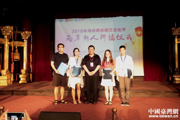 中国慈善联合会秘书长助理陈冬青为两岸新婚配偶代表赠送礼品(中国台湾网 王莉婷摄)