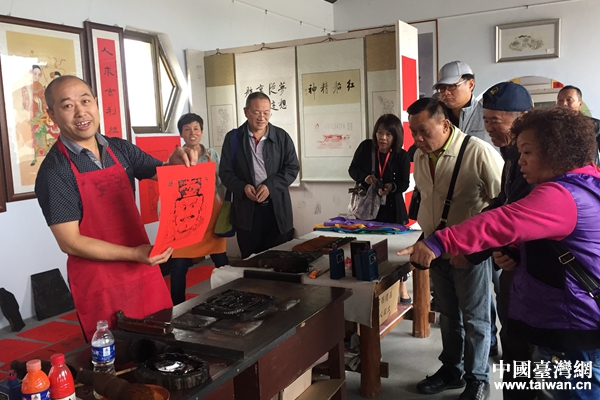 参访团成员参观木版年画制作。(中国台湾网 许晗 摄)