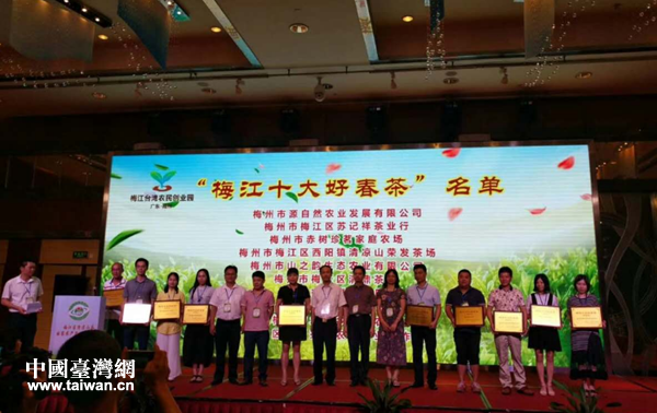海峡两岸专家为荣获”梅江区十大好春茶“的茶企业颁奖。(图片来源:梅州台创园)