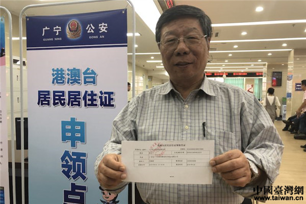 中国台湾网9月6日肇庆讯 9月1日上午,广东省肇庆市台商协会会长林谷丰带领11名台湾同胞来到肇庆市广宁县行政服务中心,在通过简单的填表、录制指纹后,就拿到了居住证领取凭证。“有了居住证之后,解决了我们外出搭乘高铁不能自助取票的问题,在经商投资方面也更方便,我会动员我们台商协会的成员来申领这个居住证。”林谷丰还说,“居住证的发放,是一项十分便民的措施,是落实惠台31条和践行“两岸一家亲”理念的具体体现。”