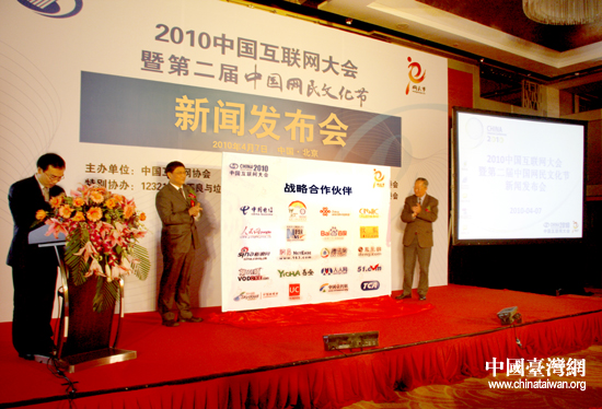 2010中国互联网大会新闻发布会4月7日在京举办。会上,中国互联网协会副理事长高新民及工业和信息化部电信管理局业务资源处处长王安平共同为中国互联网大会的20家战略合作伙伴揭幕,它们分别为:中国台湾网、中国电信、中国移动、中国联通、CNNIC、人民网、新华网、百度、搜狐、新浪、网易、腾讯、凤凰网、第一视频、易查、人人网、51.com、天云科技、优视科技、台北市电脑公会。