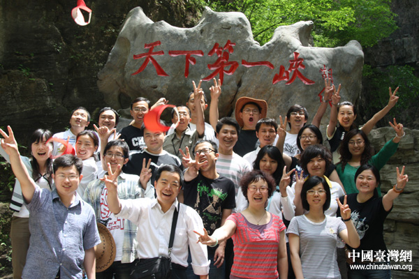 中国台湾网员工在野三坡景区著名景点百里峡合影留念。(中国台湾网 肖燕 摄)