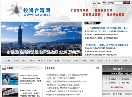 “投资台湾网”以汇集两岸相关政策信息、关注赴台投资的相关动态为主要内容,以即将和已经赴台投资的大陆企业为受众群体。关注大陆资本赴台投资的最新动向,向赴台投资的大陆企业提供两岸相关规定、信息服务和政策查询,从而促进两岸经贸交流。