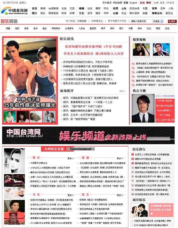 网罗两岸娱乐新鲜事 中国台湾网娱乐频道全新改版