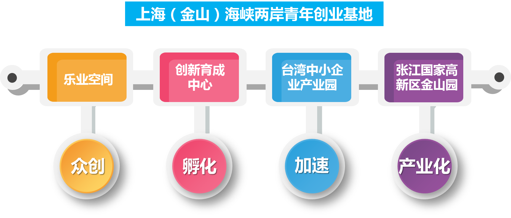 上海(金山)海峡两岸青年创业基地是国务院台办于2015年10月设立的上海首个海峡两岸青年创业基地,由乐业空间、创新育成中心、台湾中小企业产业园、张江国家高新区金山园等四块主要承载地组成,分别承载“众创、孵化、加速、产业化”功能,打造“两岸合作+公办公益、政府支持+社会参与、众创孵化+加速产业化、基地+基金”的全要素、全产业链的两岸青年创新创业基地。截至目前,基地已有45个创新创业项目(其中台资项目13个)注册落户,总注册资本2.5亿元人民币、4300万美元。