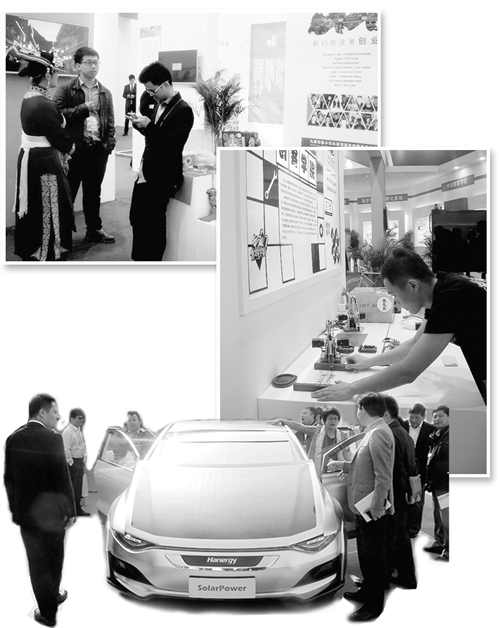 上图 汉能集团的太阳能薄膜发电概念车,引起了许多参加首届全国大众创业万众创新活动周的创客关注。 本报记者 佘惠敏摄